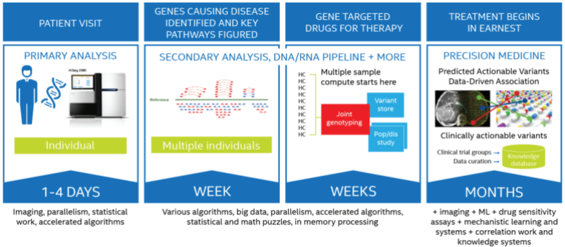 Intel created an initiative referred to as “All in One Day” to create a objective for the clinical business: take a affected person from preliminary scan(s) to precision medicine-based movements for remediation in most effective 24 hours. This comprises genetic sequencing, research that yields insights into the cellular- and molecular-level pathways concerned within the most cancers, and identity of gene-targeted medication ready to ship the most secure, most efficient treatment conceivable.