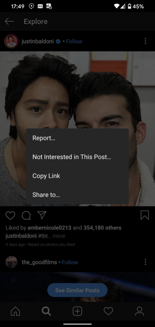 When you see one thing at the Discover web page you don’t like, faucet it, hit the Menu button within the top-right, and make a choice No longer Keen on This Put up. This may disguise the put up from Discover and display fewer find it irresistible sooner or later.