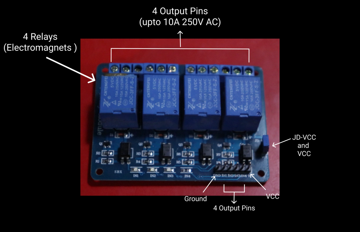 The Relay Board makes use of electromagnets to make and damage the circuits. This one right here 4 four channels, however you’ll be able to simply purchase as much as 16 channels. The choice of channels method the choice of gadgets you’ll be able to attach directly. This relay can care for as much as 10A 250V AC. There are 4 enter pins (IN 1–four) to keep an eye on 4 relays. You’ll be able to use Node-MCU to energy the board, however this can be a just right concept to isolate the board from the micro-controller, to try this attach voltage pin from Node-MCU to VCC and separate 5V energy provide to JD-VCC and GND.