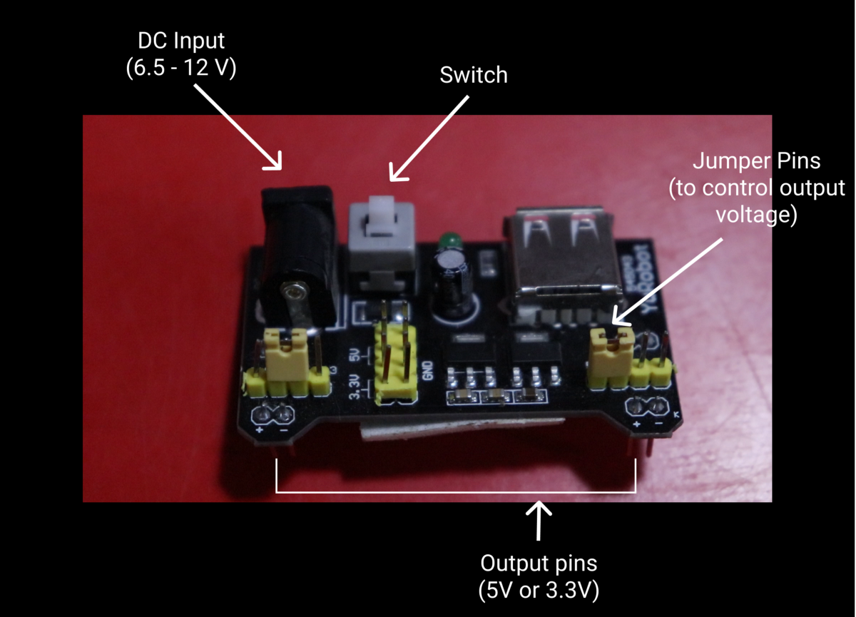 The breadboard energy provide can output 5V, three.3V, or each. There are two output pins and two jumper pins to set the configuration. It calls for 6.5V–12V to serve as. In case you are the usage of each the pins, use the 12V enter to maintain voltage drops. You’ll be able to additionally energy it the usage of USB. There’s a transfer to show off and on the instrument.