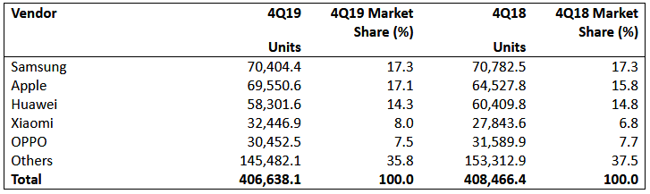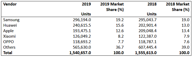 Above: Desk 1: International Smartphone Gross sales to Finish Customers by way of Dealer in 4Q19 (Hundreds of Devices)