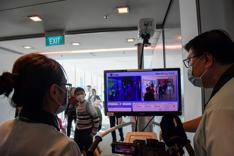 Above: Well being officials display screen arriving passengers from China with thermal scanners at Changi Global airport in Singapore on January 22, 2020.