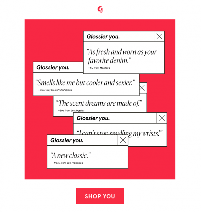 The collection of testimonials was once put in combination the use of customers’ comments for the emblem’s first perfume, Glossier You.