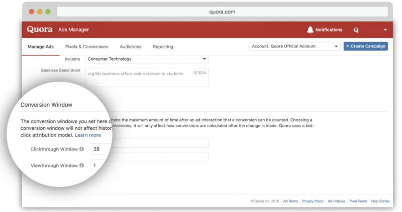 Conversion home windows. To present companies a greater figuring out in their buyer trips, Quora’s new Conversion Home windows lets in advertisers to suggest how lengthy after an advert interplay a conversion will also be counted.