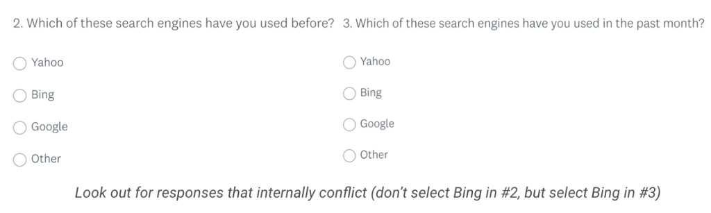 We extensively utilized equipment like SurveyMonkey and UserTesting to search out numerous units of folks and perceive their wishes when it got here to our product. This comments helped affect our roadmap and supplemented tester comments. Something to bear in mind with self-reported knowledge, numerous or in a different way, is that you will need to take away moved quickly or inconsistent responses. I’ve integrated a couple of examples underneath of questions you’ll use to weed out low-quality responses.