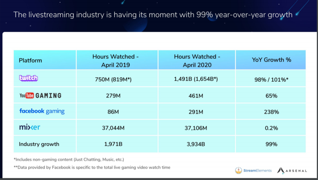 Twitch’s gaming content material used to be up 98% from 750 million hours watched to at least one,491 million hours watched. However it’s no longer the one platform seeing enlargement.